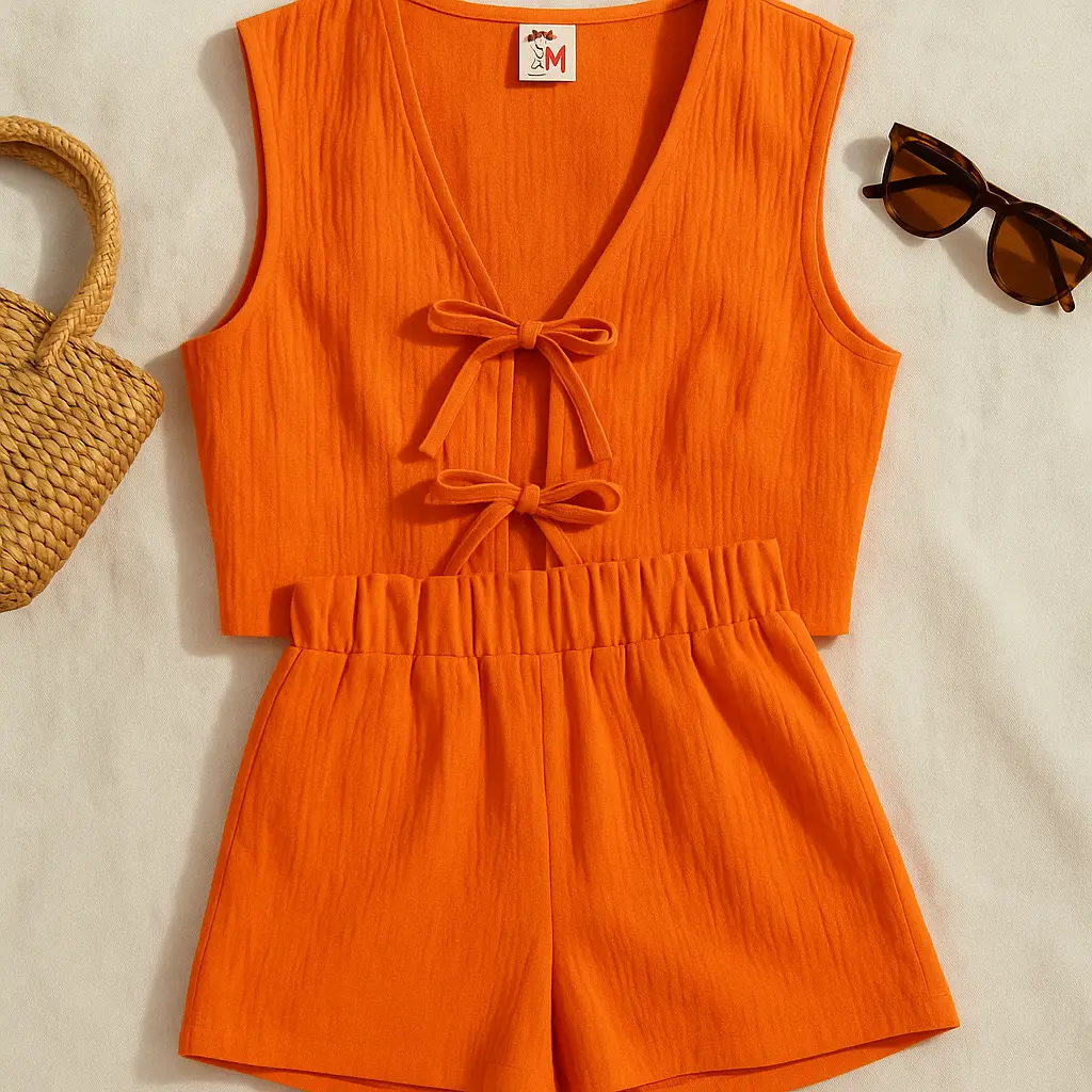 Etiketler: 2025 kadın modası, alt üst kombin, doğal kumaş giyim, fiyonklu yelek takım, kadın yazlık takım, keten takım, keten yazlık set, portakal renkli takım, rahat yaz kombini, yazlık şort yelek