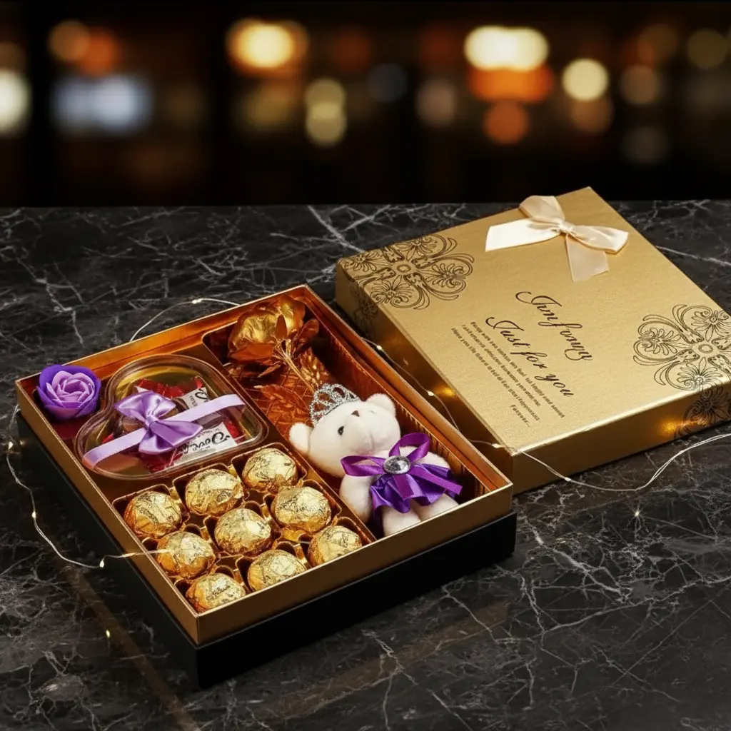 Kutunun içinde özenle seçilmiş gurme çikolatalar, estetik olarak düzenlenmiş şekilde sunulur. Her bir çikolata, yüksek kaliteli kakao ile hazırlanır ve taze, yoğun aromasıyla damakta iz bırakır. Kutunun merkezinde yer alan sevimli peluş ayıcık ise hediyeye duygusal bir sıcaklık katar. Bu ikili, romantizmin, samimiyetin ve özenin mükemmel birleşimidir.